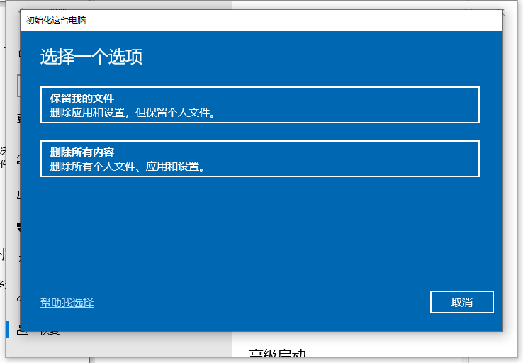 4、出現“選擇一個選項”對話框后,根據實際需要點擊合適的選項,等待操作完成即可(注:重置前先備份電腦的重要資料)。