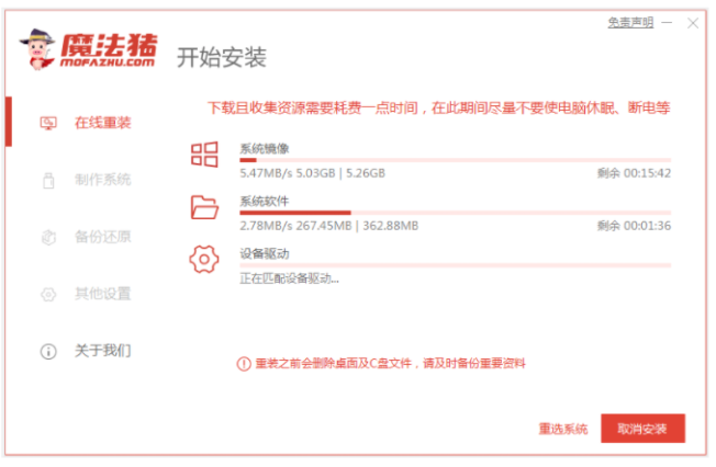 1、電腦里下載安裝并運行魔法豬一鍵重裝系統軟件。你選擇需要安裝的系統單擊開始安裝。