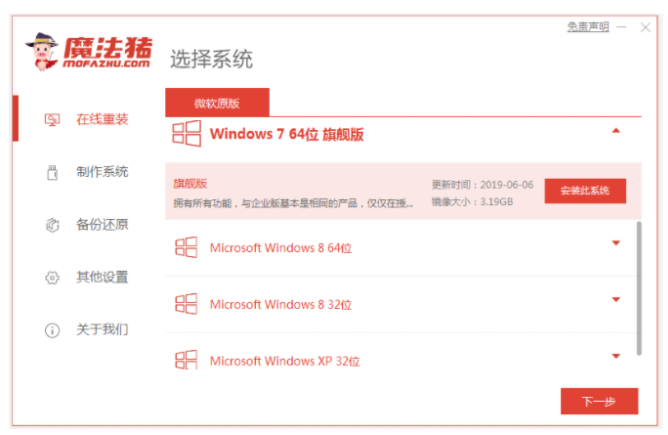 1、運行魔法豬一鍵重裝系統軟件,要選擇需要的系統單點擊安裝。