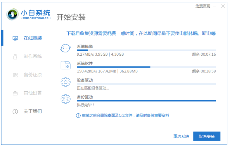 2、耐心等待軟件自動開始下載win7系統文件和驅動等。