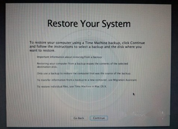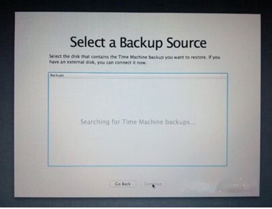 6、如果點擊 Restore From Time Machine Backup,記著此時要將過去用作 Time Machine 備份的外置硬盤與 MacBook Air連接后 ,再點按「Continue」。