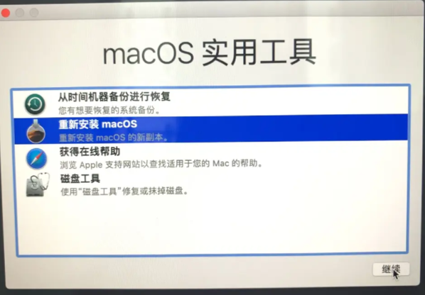 6、回到macOS實用工具界面,選擇重新安裝 macOS進入下一步。(注意:您的電腦這個時候要先設置聯網) 。