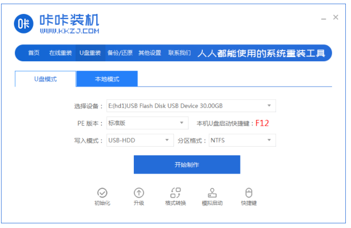 1、首先打開咔咔裝機后插入U盤,選擇系統制作U盤啟動盤。