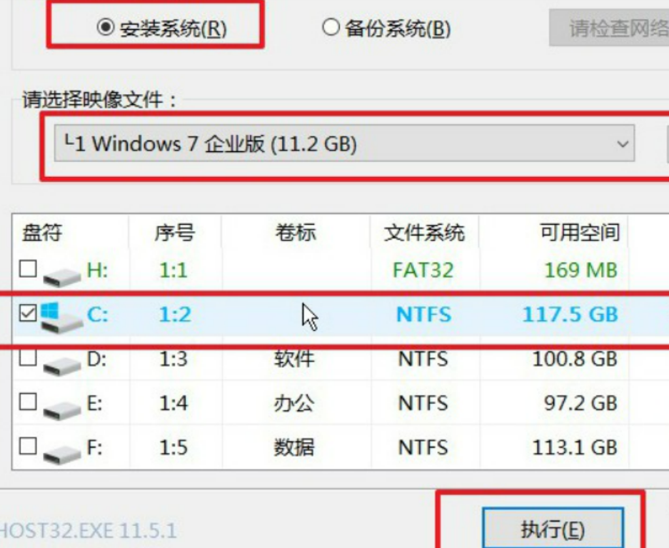 6、進入u盤系統桌面后,打開一鍵裝機工具,一般情況下會自動檢測win7鏡像,選擇安裝c盤,點擊執行。