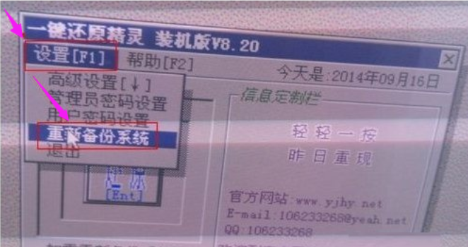 4、出現下面的界面時,按Esc鍵進入到下一個界面。然后再點擊“設置”,在打開的菜單中,選擇“重新備份系統”,接著按照步驟來進行即可。