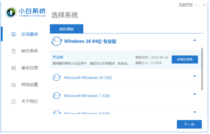 1、小白一鍵重裝系統工具重裝系統方法,首先在電腦的瀏覽器查找下載安裝小白一鍵重裝系統軟件,選擇需要安裝的系統,點擊安裝此系統,點擊下一步。