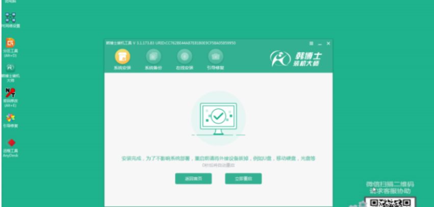 6、安裝部署完成后,選擇立即重啟。重啟電腦選擇韓博士PE模式進行安裝。