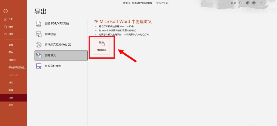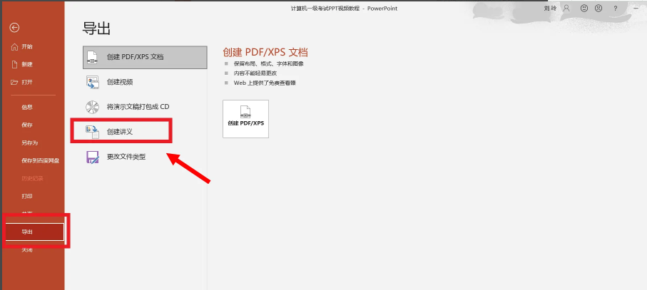 第三步,接著點擊左邊一側一欄中的“導出”,選擇“創建講義”。