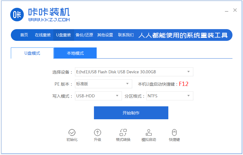 1、打開咔咔工具,插入u盤制作啟動盤;