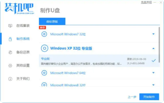 2、選擇我們需要安裝的xp系統,然后選擇后點擊開始制作。