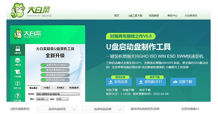 1、需要先制作U盤啟動盤,下載安裝大白菜u盤啟動盤制作工具,用于制作U盤啟動盤。