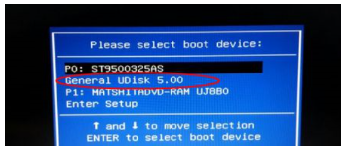 2、把U盤插到需要安裝操作系統的電腦上,重啟電腦之后不停按F12、F11、Esc等快捷鍵打開啟動菜單,選擇U盤選項按回車。