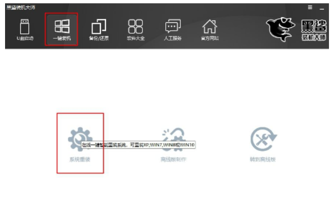 1、我們可以下載安裝一個黑鯊裝機大師到電腦上,雙擊打開后點擊一鍵裝機,選擇系統重裝。