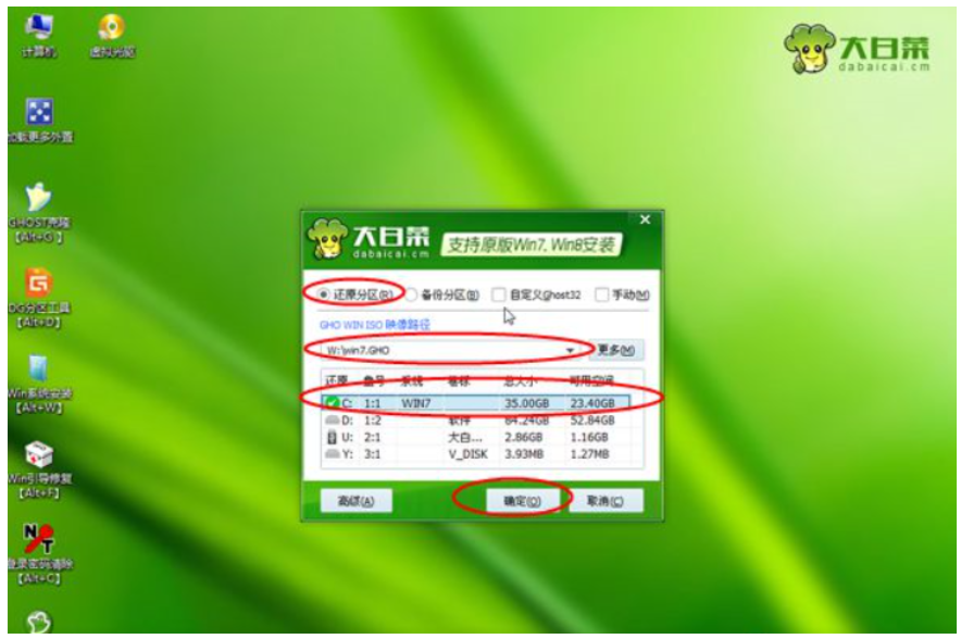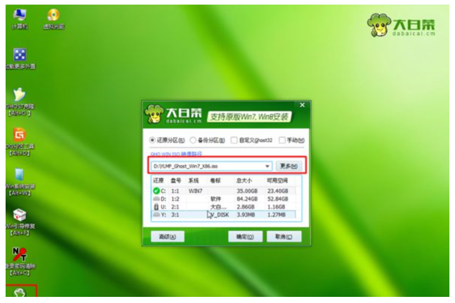 4、進入到pe系統之后,打開【大白菜一鍵裝機】,選擇映像徑,將會自動提取gho文件。