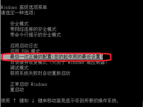 我們先重啟電腦,然后按住F8鍵,等待系統進入如下圖畫面,然后選擇“最后一次正確的配置”,等待系統恢復即可。