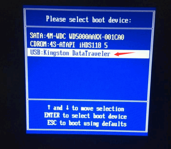 6.重啟時快速按F12進入到啟動項頁面,選擇“USB”U盤啟動盤進入。(不知道啟動項按鈕的點擊查看快捷鍵大全)