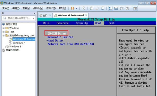 5、重啟虛擬機按F2進入BIOS,或者關閉虛擬機,在左側選擇xp虛擬機—電源—打開電源時進入固件。到Boot,選擇CD-ROM Drive選項,按Shift和+號將CD-ROM Drive移動到第一位,按F10保存重啟。