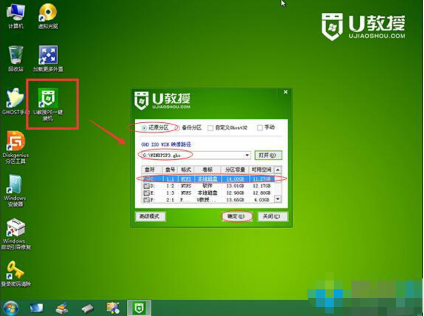 4、點擊打開【U教授PE一鍵裝機】,選擇安裝盤符C盤,確定。