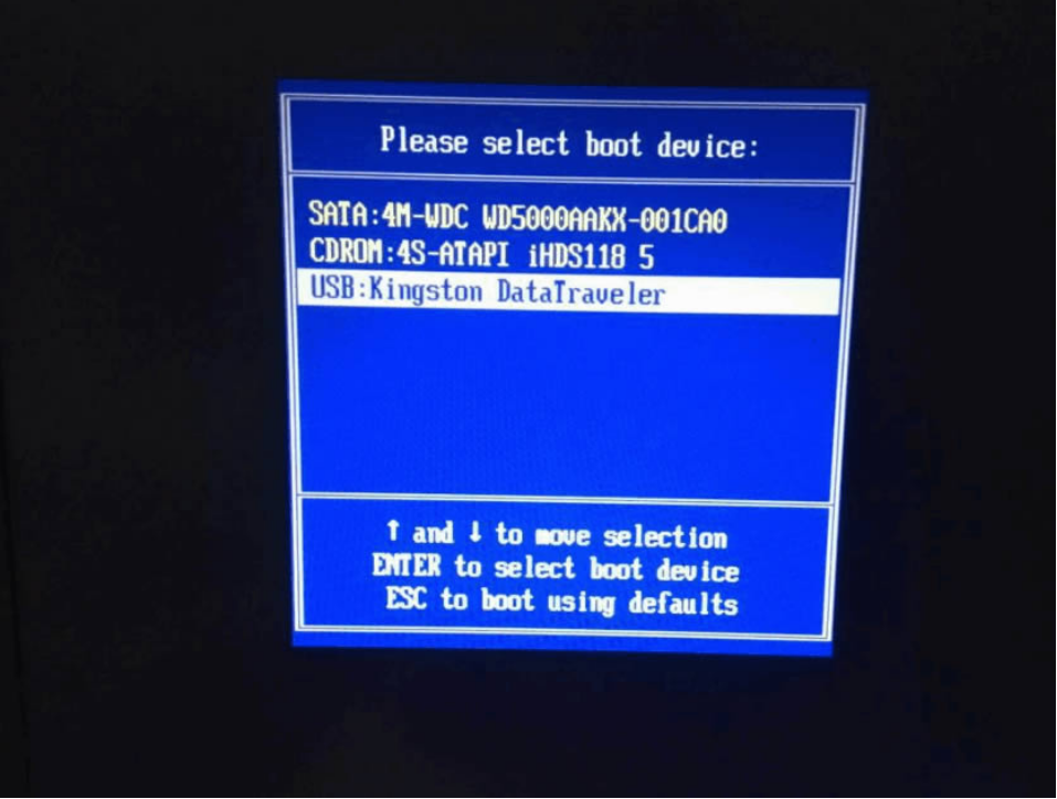 6、打開計算機后,熱鍵立即為F12,ESC,F8等。出現的界面中,找到U盤選項,選擇Enter進入,然后出現系統主目錄選擇界面,選擇【1】 Enter輸入。