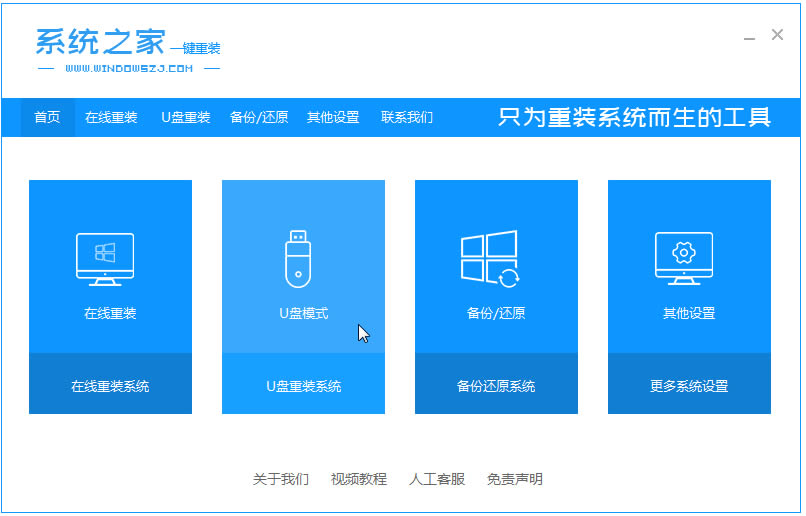 1、xp原版系統iso鏡像安裝步驟,首先下載一個“系統之家一鍵重裝系統”工具,然后在頁面中選擇”u盤模式“。