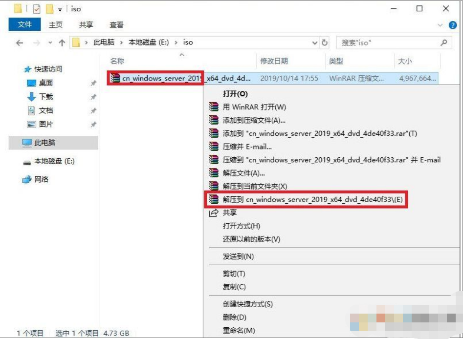 1、,服務器操作系統Windows Server2019安裝步驟,首先要先下載Windows Server 2019到電腦硬盤上,下載完成后,找到系統文件,按右鍵把下載好的系統進行解壓。