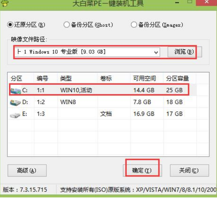5.打開大白菜pe一鍵裝機工具,點擊“瀏覽”,將win10鏡像文件添加進來,選擇c盤為安裝盤,點擊確定。