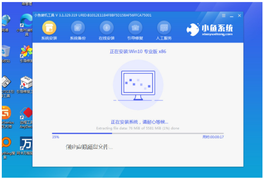 4、插入啟動盤進電腦中,開機按啟動熱鍵進啟動界面,選擇u盤啟動項回車確定進入到小魚pe系統,在pe系統桌面上打開小魚裝機工具,選擇系統點擊安裝。