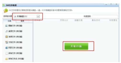 3.接著會彈出360文件恢復窗口,我們選擇c盤驅動器,點擊“開始掃描”。