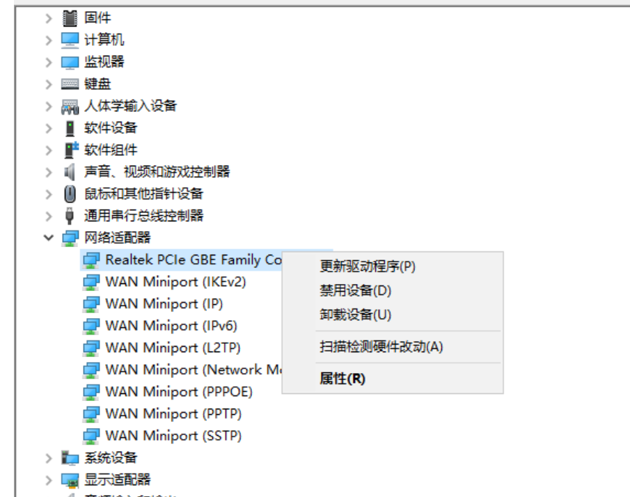 4、網絡適配器下,可以查看是否有異常的網卡驅動;如果有異常的網卡驅動,點擊右鍵,選擇更新驅動程序卸載設備后再重新安裝;