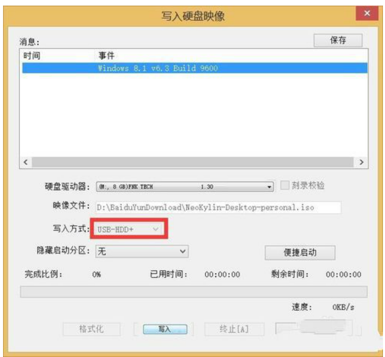 4.打開“定稿硬盤鏡像”窗口中,從“磁盤驅動器”列表中選擇“U盤”,同時將“寫入方式”設置為“USB-HDD”,點“寫入”按鈕即可創建啟動U盤。