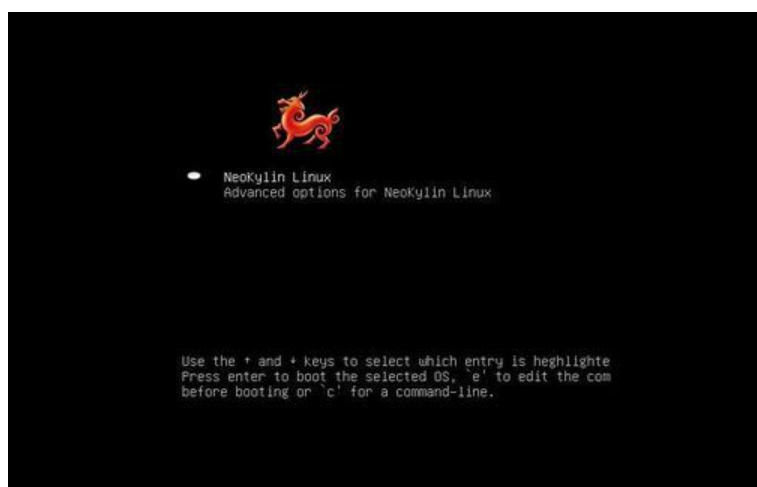 10.計算機重啟電腦后,將顯示如圖所示的“啟動菜單”,直接光標選擇“NeoKylin Linux”(中標麒麟操作系統),并按回車進入系統。