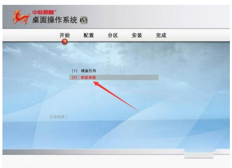 6.重啟電腦則自動從U盤引導啟動系統,待顯示如圖所示的“中標麒麟桌面操作系統”安裝頁面中,利用光標選中“安裝系統”項并按回車鍵繼續。