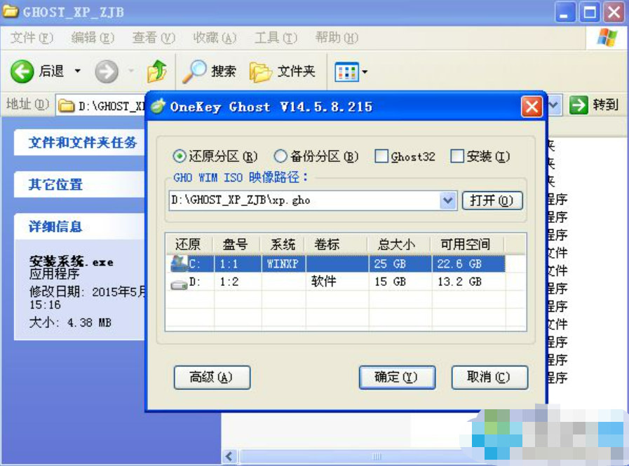 3、雙擊“安裝系統.exe”打開OneKey ghost裝機工具,點擊“還原分區”,GHO WIM ISO映像路徑默認會提取到xp.gho,選擇雨林木風xp系統安裝位置,一般是C盤,點擊確定。