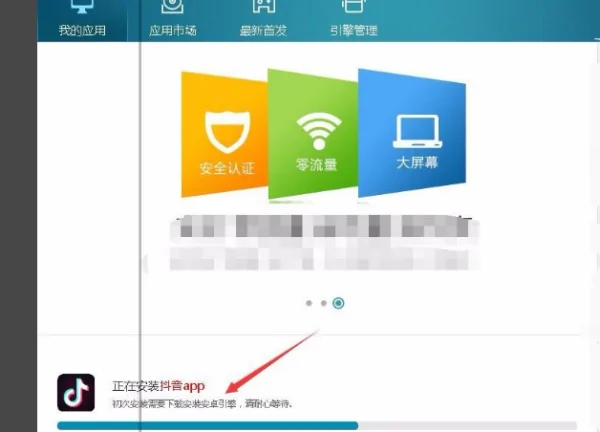 4、這里提醒大家,安裝過程不要干預,等待自動安裝完成即可,自動安裝過程為自動下載并安裝安卓引擎來支撐app軟件在電腦中進行安裝,如下圖紅色箭頭。