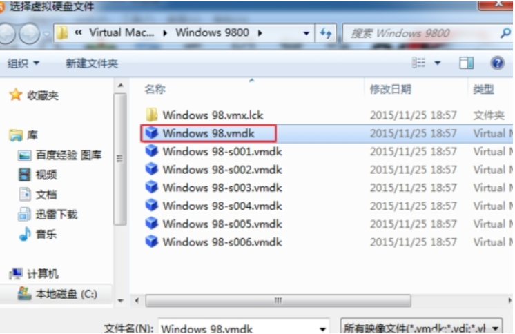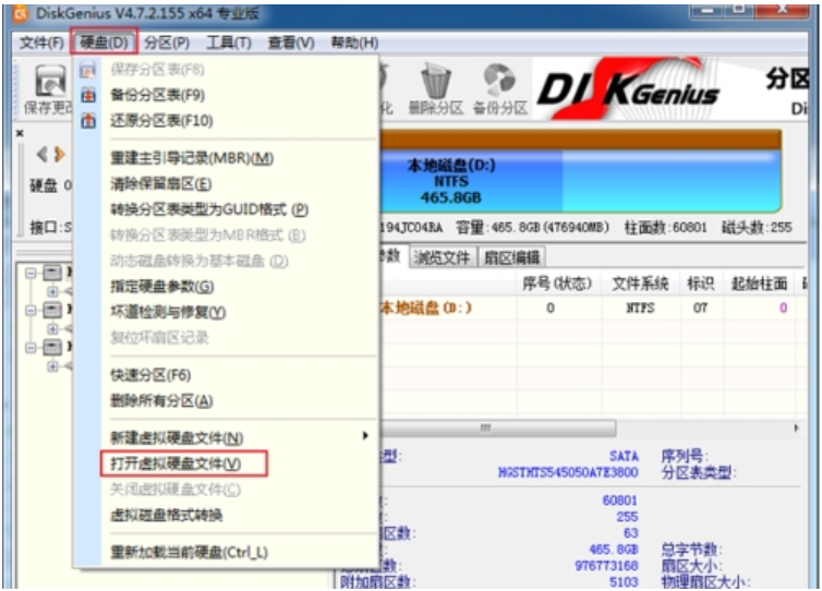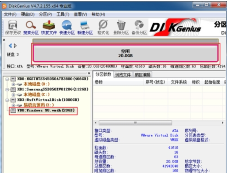 3、打開 diskgenius破解版本!點擊硬盤D,點擊打開虛擬硬盤文件(V);選擇上面我們 新創建好的虛擬機Windows 98系統.選擇;Windows 98.vmdk;點擊 ;打開。