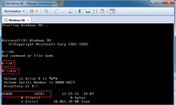 8、自動重啟后,輸入: ;D:; --> 按鍵 ;回車; 切換分區。在輸入: ;dir; --> 按鍵 ;回車; 查看 當前目錄 有什么文件:看到 d盤分區。下面有個 win98 目錄如果Diskgenius下面復制進去的是win98 SE就會看到SE的。