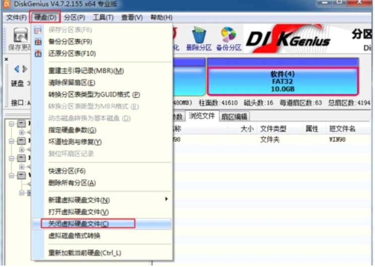 5、點擊硬盤(D),關閉虛擬機硬盤文件(C);關閉Diskgenius軟件。