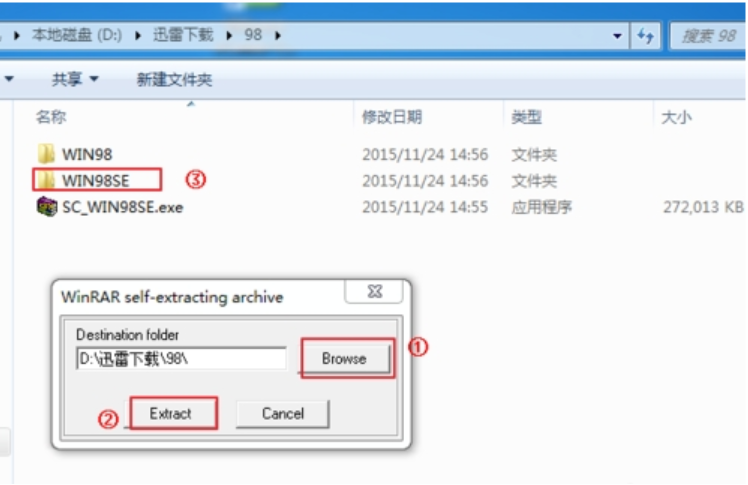 1、首先我們將win98系統下載到非系統盤當中,然后將其進行解壓,解壓后有兩個 版本98 文件,任意一個即可,98 SE是98的升級版。