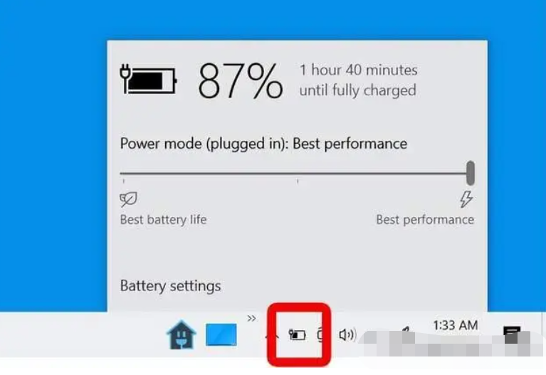 2、還可以通過單擊任務欄中的電池圖標并將滑塊一直向右移動來快速關閉省電模式。