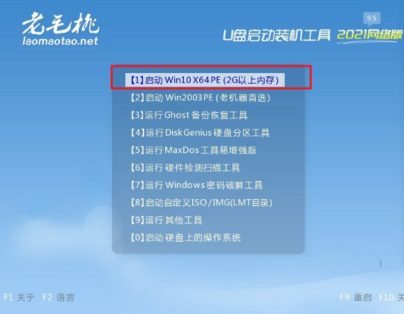 2、如圖所示,進入老毛桃PE選擇界面,選擇【1】啟動Win10 X64PE(2G以上內存),回車進入即可。