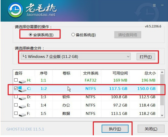 3.在老毛桃winpe桌面中,打開老毛桃一鍵裝機,選擇u盤里面的Windows7系統鏡像,安裝在“C盤”,點擊“執行”。