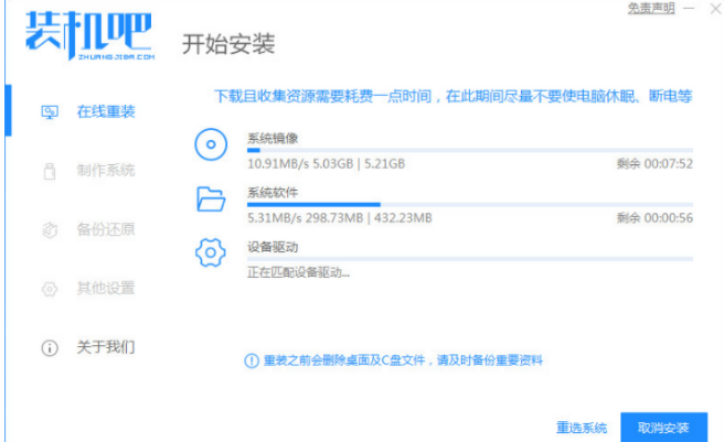 1.首先我們進入到【裝機吧在線系統重裝】工具的主頁,選擇win10系統進行安裝。