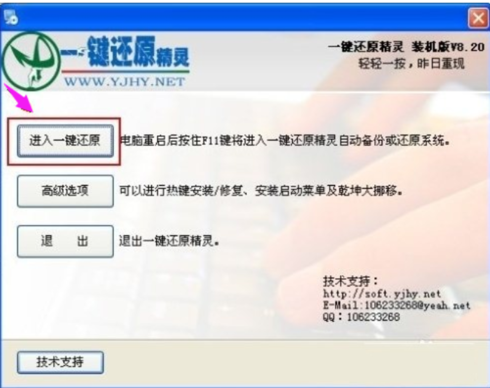 1、首先打開安裝好的“一鍵還原精靈”,點擊“進入一鍵還原”,進行系統的備份。