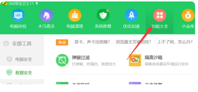 1、打開360安全衛士,點擊選擇上面的“功能大全”。