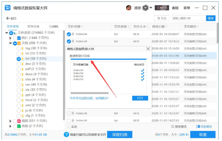 3、數據掃描完成后,選擇需要恢復的文件,點擊“恢復”。