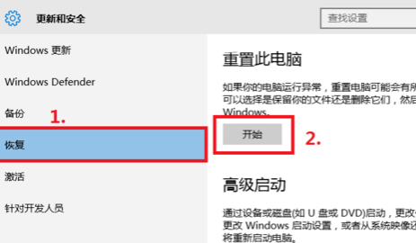 3.在最左側點擊【恢復】,再點擊重置此電腦下的【開始】。