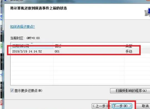 4、在向導中點擊下一步來到如下系統還原界面,選擇一個還原點,然后點擊下一步。