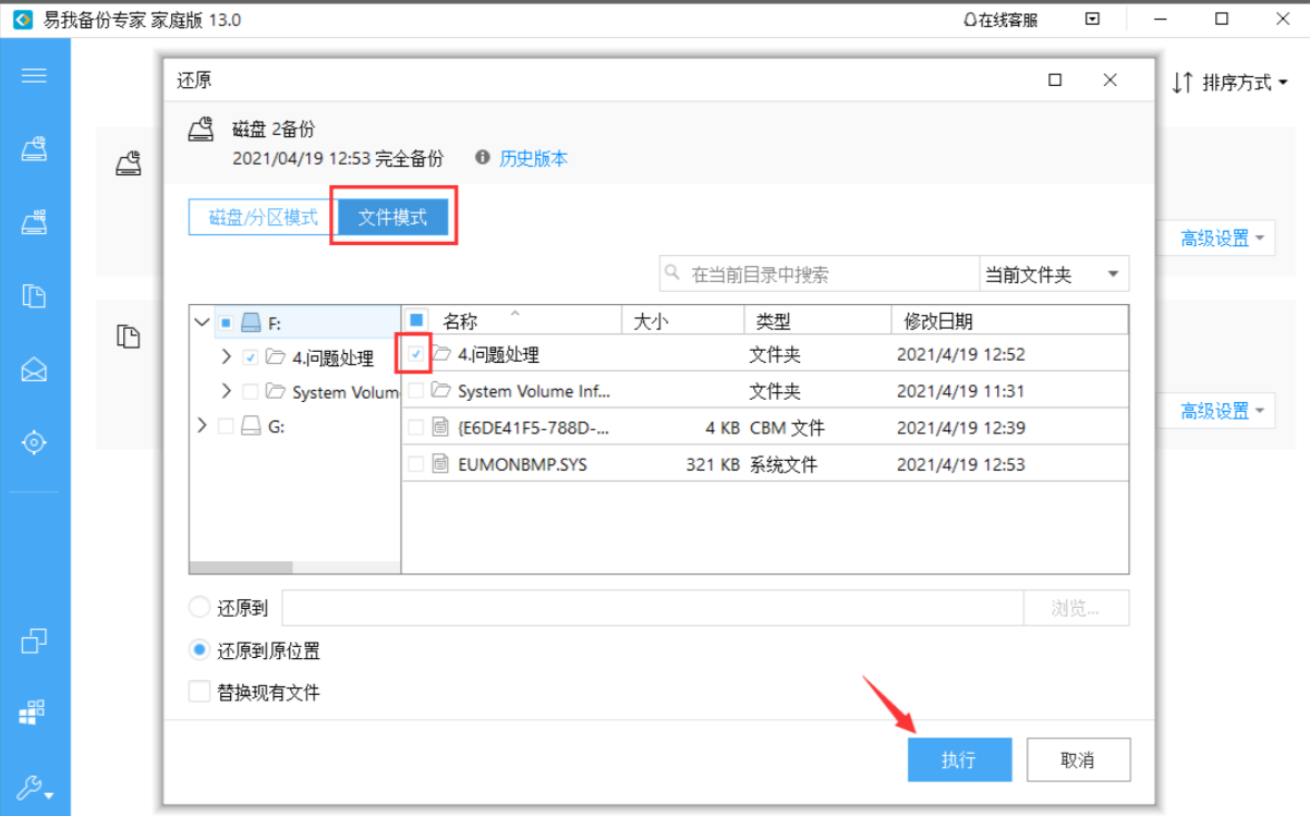 9、也可以從磁盤/卷備份鏡像中僅還原單個文件,只需要在還原時選擇“文件模式”,然后勾選需要的文件進行還原即可。