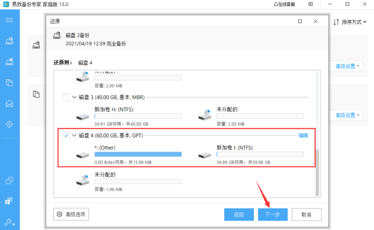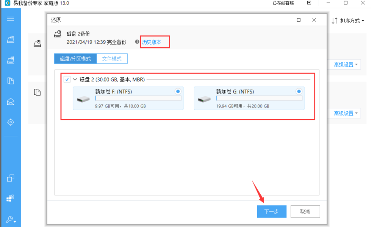 7、選擇一個歷史版本的備份鏡像,勾選需要還原的磁盤/卷,點擊“下一步”。