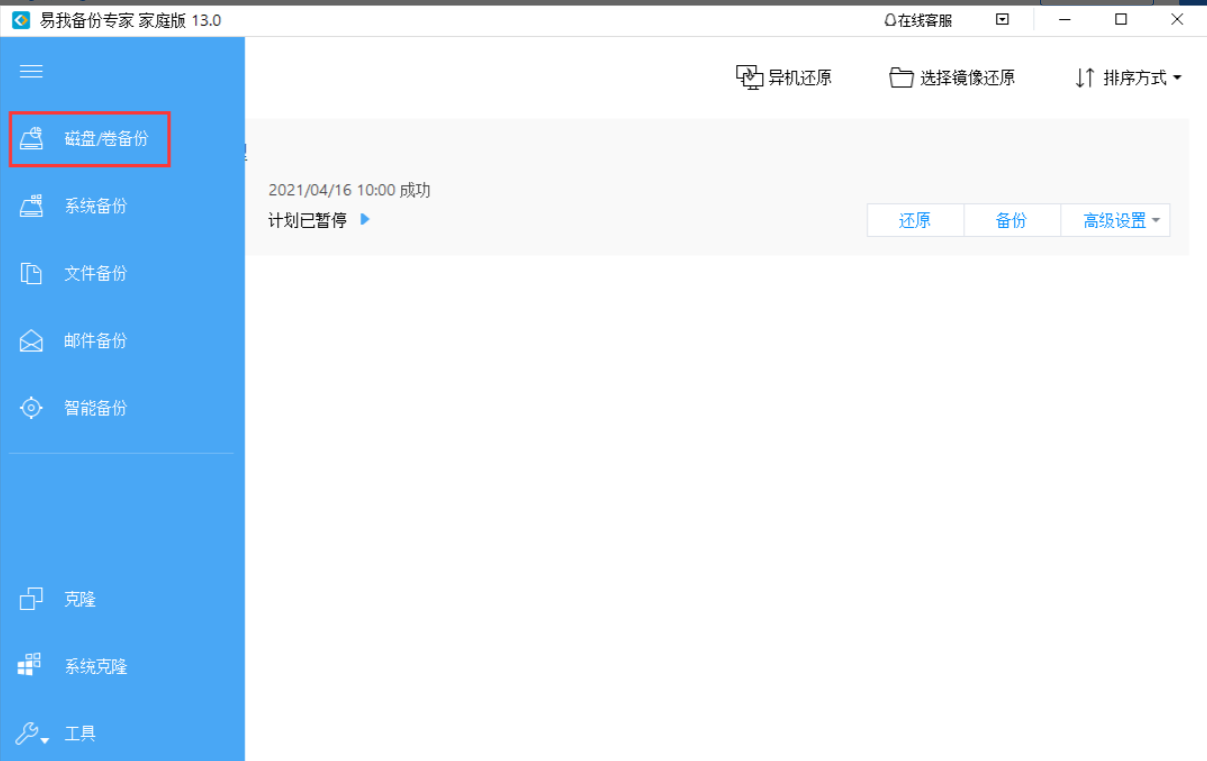 1、展開易我備份專家左側的功能列表,選擇“磁盤/卷備份”。